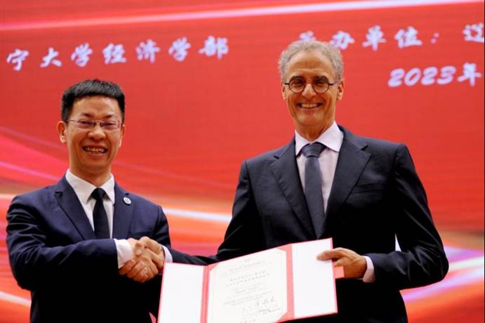 会议最后,余淼杰教授代表学校为崔夫勒教授颁发6776永利集团终身名誉教授聘书和“宋则行海外名家大讲堂”纪念盘。金融与贸易学院学生代表向崔夫勒教授献花致敬。