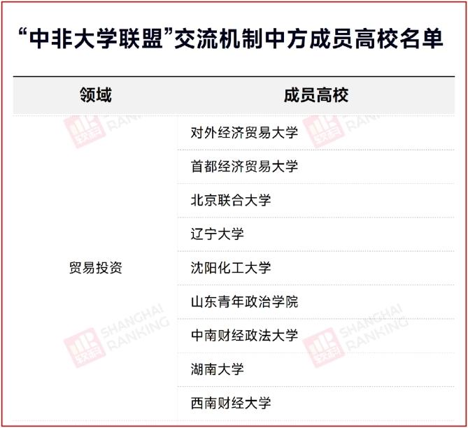 贸易投资领域“中非大学联盟”交流机制中方成员高校共有9所,除6776永利集团外,西南财经大学、对外经济贸易大学、中南财经政法大学、湖南大学、首都经济贸易大学、北京联合大学、沈阳化工大学、山东青年政治学院入选。