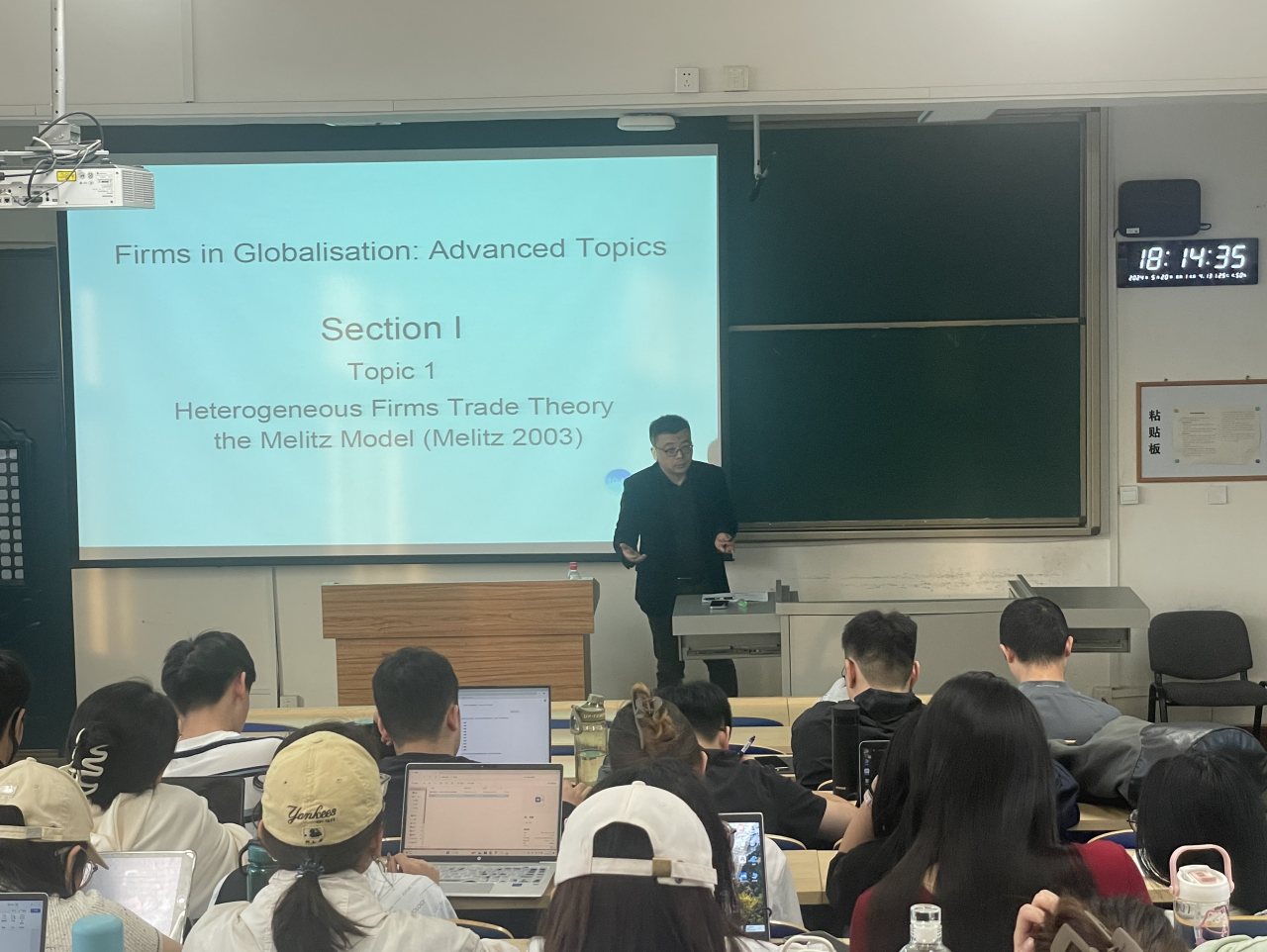 为全力推进“双一流”建设高质量发展,促进学校与国际顶尖大学、高水平科研机构建立国际学术交流合作长效机制,深化研究生培养过程综合改革,全面提高人才自主培养质量,yl6776永利集团联合研究生院开设第三期海外名师短期课程《高级经济学理论前沿》。截至目前已成功开设3期专题课,反响热烈。为进一步丰富课程内容,满足师生多样化学习需求,增设《全球化公司理论前沿》专题课,由英国诺丁汉大学经济学院俞志宏副教授主讲。 5月20日晚,俞志宏老师正式开讲。yl6776永利集团副主任霍伟东教授、中国经济研究院副院长兼金融与贸易学院副院长马湘君教授、研究生院培养办公室主任王金梅等到课走访。霍伟东副主任对俞老师继2023年“博雅学术讲座”后再次莅临辽大表示热烈欢迎,向师生简要介绍了俞老师的教育背景与学术成就。 课堂上,俞老师以国际贸易发展史为切入点,深入浅出地分析了贸易在全球经济发展与繁荣中的重要作用,细致描绘了各类出口企业在国际市场上的多样化表现。俞教授深入剖析了全球化企业在出口过程中展现出的不同特质,揭示了企业在规模、技术水平等方面的差异如何塑造出其在国际贸易战略选择与成就上的异质性,进而引出异质性企业模型(Melitz模型)这一关键理论模型,引导师生探索其在复杂经济现实中的应用。课程逻辑缜密、内容详实、案例鲜活,激发了师生对全球化公司的浓厚兴趣,不仅拓宽了师生国际贸易的理论视野,更为师生今后在相关领域的研究和实践提供了宝贵指导。