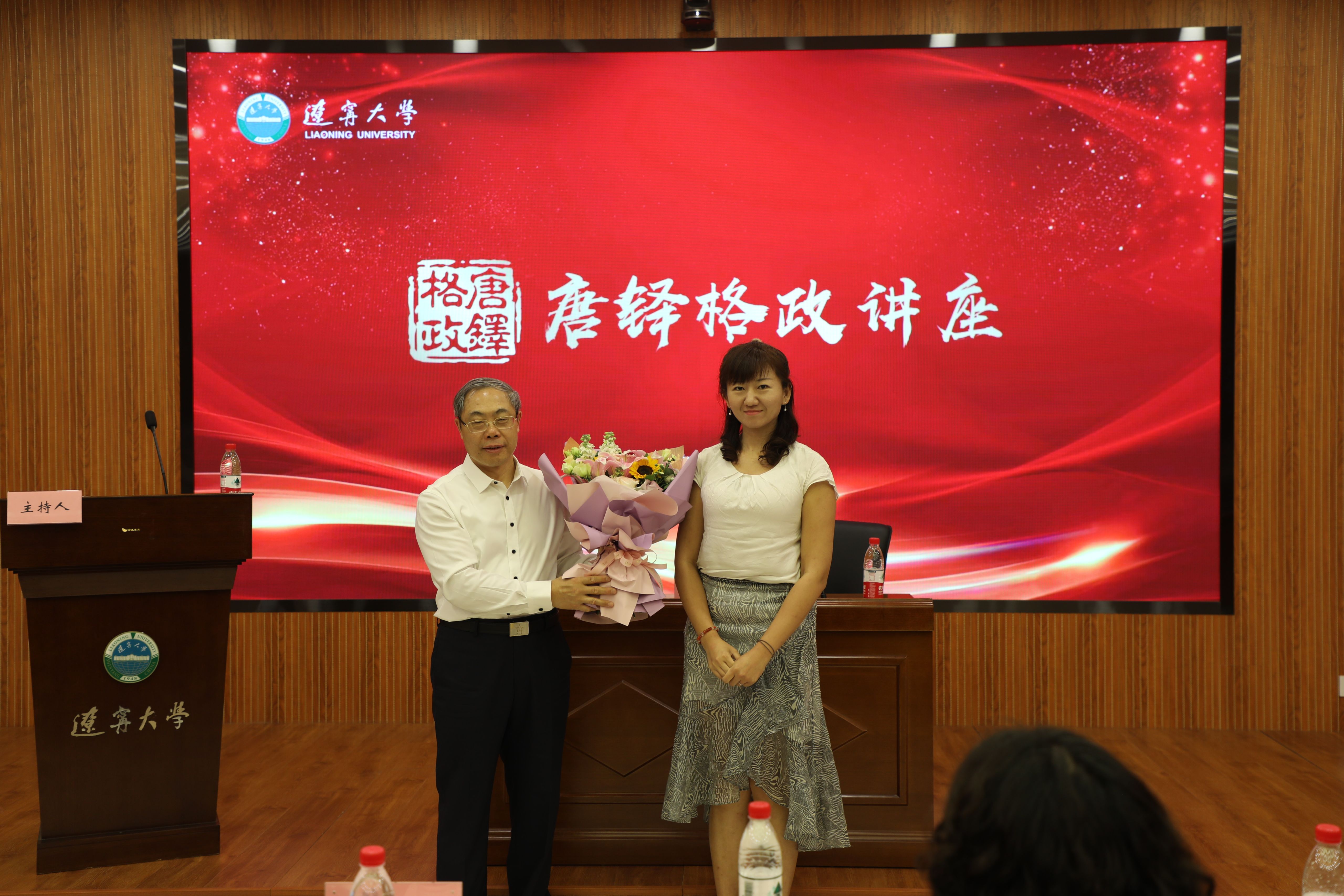报告会结束后,李宇鹏副校长为蒋辅义教授颁发“唐铎格政讲座”纪念证书、纪念盘,中国经济研究院副院长兼金融与贸易学院副院长马湘君教授向蒋辅义教授献花致敬。