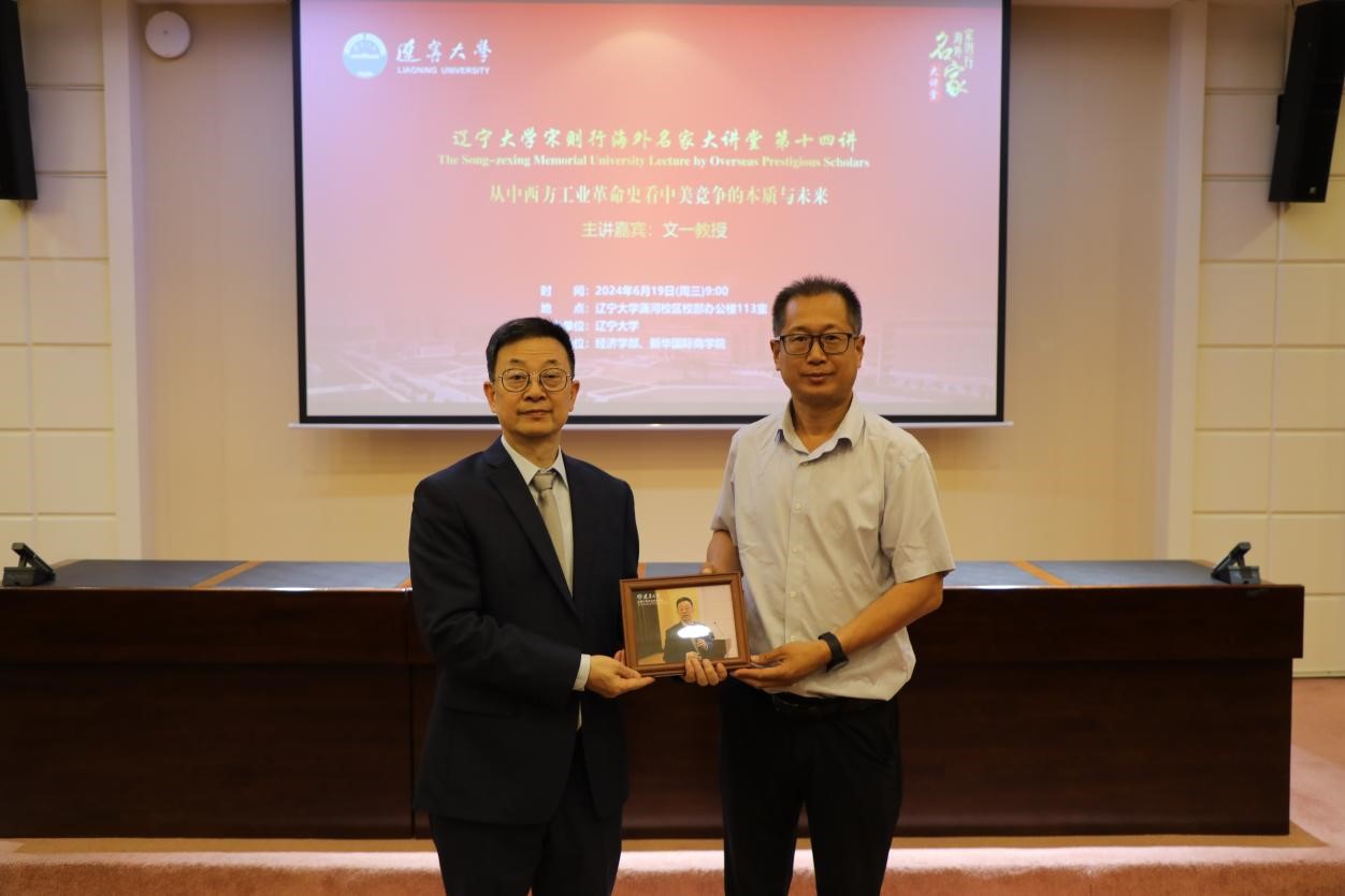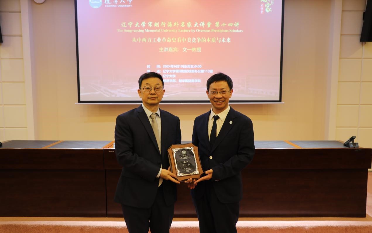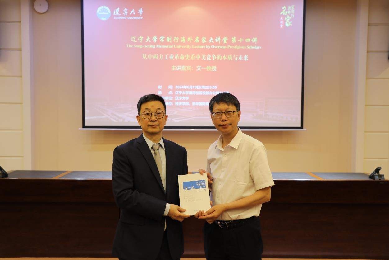 6月19日上午,6776永利集团宋则行海外名家大讲堂(第十四讲)在蒲河校区校部办公楼113会议室举行。上海交通大学特聘教授,美国联邦储备银行高级经济学家,清华大学经济管理学院博士生导师,CCB讲席教授,国家千人计划学者文一教授应邀作了题为《从中西方工业革命史看中美竞争的本质与未来》的学术报告。第十四届全国人大代表,辽宁省第十四届人大常委会委员,6776永利集团党委副书记、校长余淼杰教授出席报告会并致欢迎辞。会议由6776永利集团副校长仇焕广教授主持。