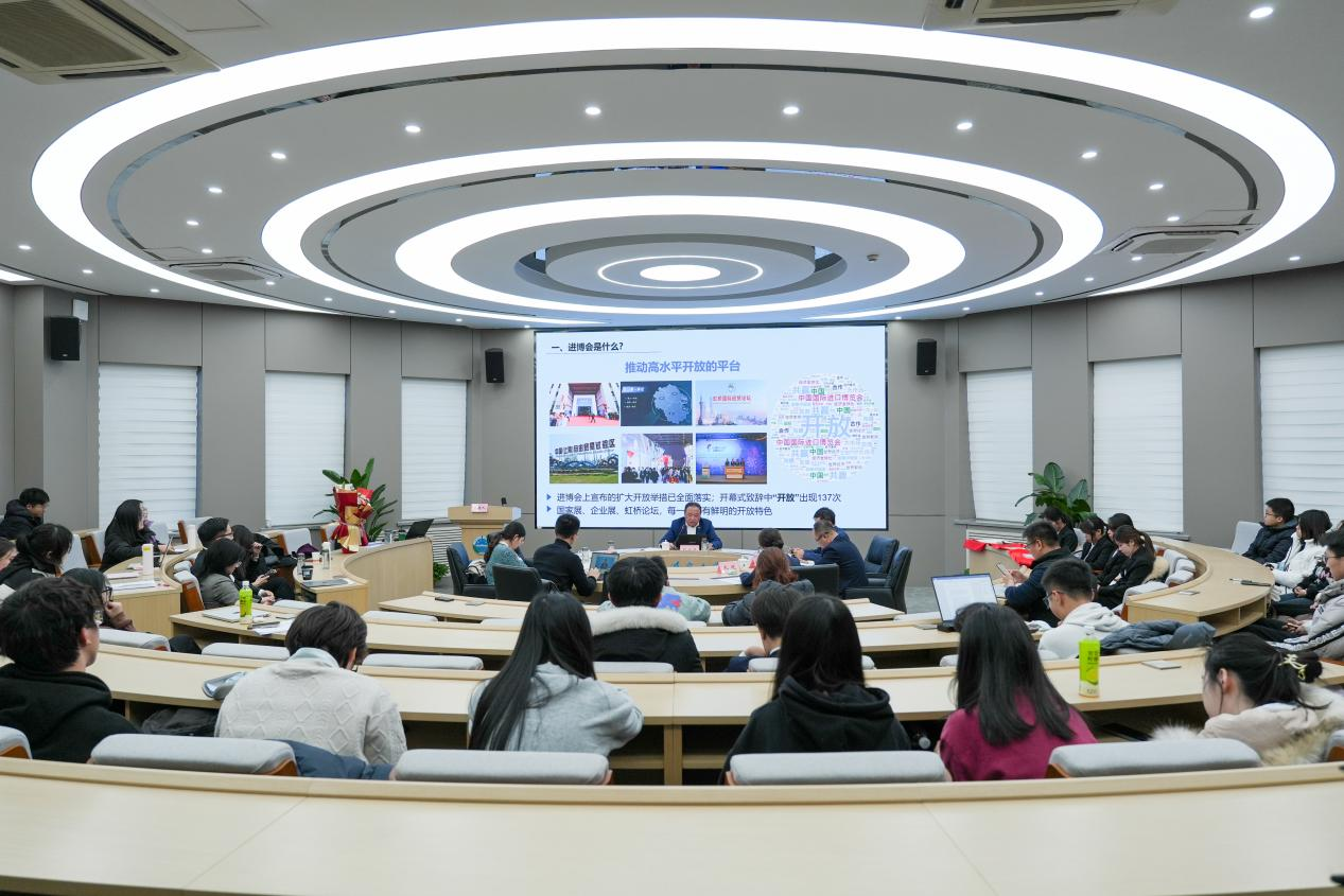 孙成海以《进博会:是什么、为什么、怎么越办越好》为题,从多重维度进行全面阐释。首先对进博会的概念进行了解读,指出进博会是由中国举办的、国际社会广泛参与的、以进口为主题的国家级博览会,包括企业商业展、虹桥国际经济论坛、国家综合展等板块。自2018年首届进博会举行以来,习近平主席多次在进博会开幕式上发表主旨演讲、致辞或向进博会致信,并将进博会总结为构建新发展格局的窗口、推动高水平开放的平台、全球共享的国际公共产品,高度概括了进博会是什么的问题。随后,从三个方面分析为什么要举办进博会,一是国家战略需要,体现了中国决定主动扩大进口、进一步开放中国市场的坚定决心和展示推进高水平开放的坚定信心;二是中国发展需要,反映了中国贸易地位的提升、发展阶段的变化与发展思路的转变;三是中国推动构建人类命运共同体的务实举措,促进了经济与人文融合发展。之后,他分析了进博会越办越好的主要原因,一是以习近平同志为核心的党中央的集中统一领导,二是我们的举国体制能集中力量办大事,三是因为中国综合国力的明显提升。最后,他结合工作实践,分享了三点重要体会,一是办好中国的事情,关键在党;二是坚定不移扩大高水平对外开放;三是中国式现代化具有中国特色、符合中国国情,未来可期。
