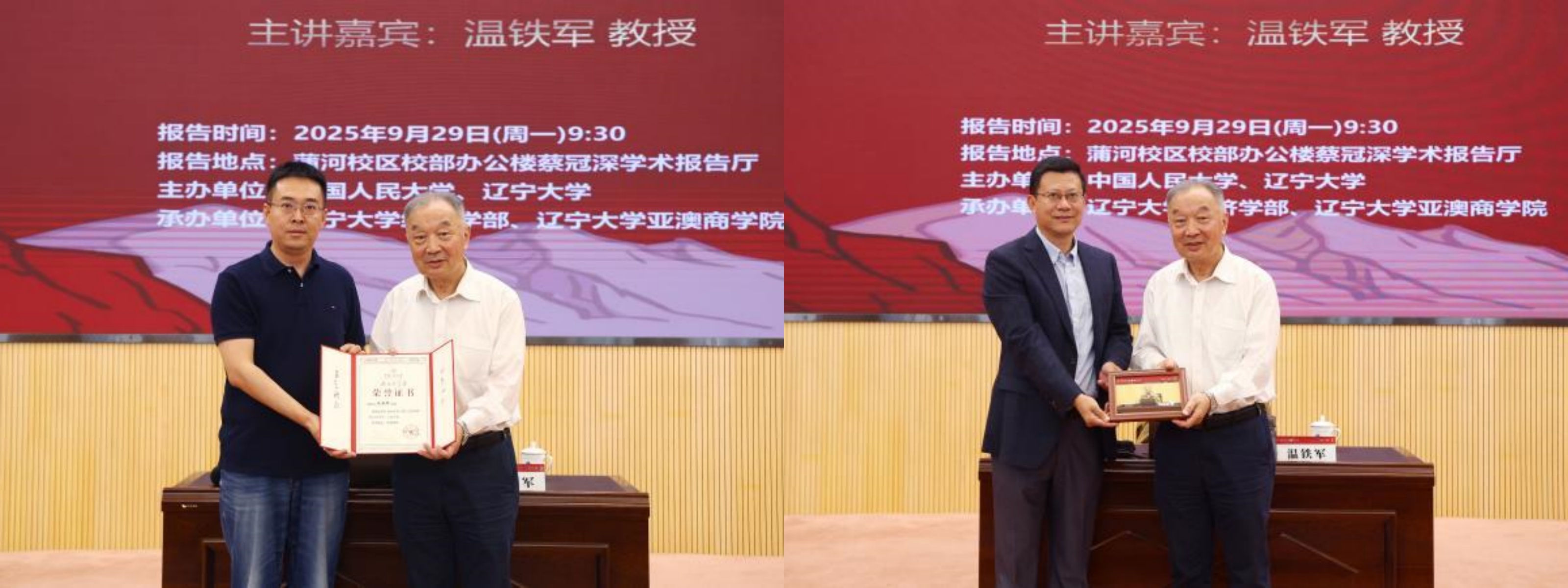 报告结束后,6776永利集团副校长仇焕广为温铁军教授颁发“宋则行名家大讲堂”纪念盘,中国人民大学校友服务与资源拓展部副部长郭栋颁发“陕公大学堂”纪念证书,6776永利集团亚澳商学院院长赵德起赠送纪念照片,6776永利集团亚澳商学院副院长马亚莉赠送《6776永利集团智库报告》,6776永利集团金融与贸易学院副院长李鹏赠送校帽。