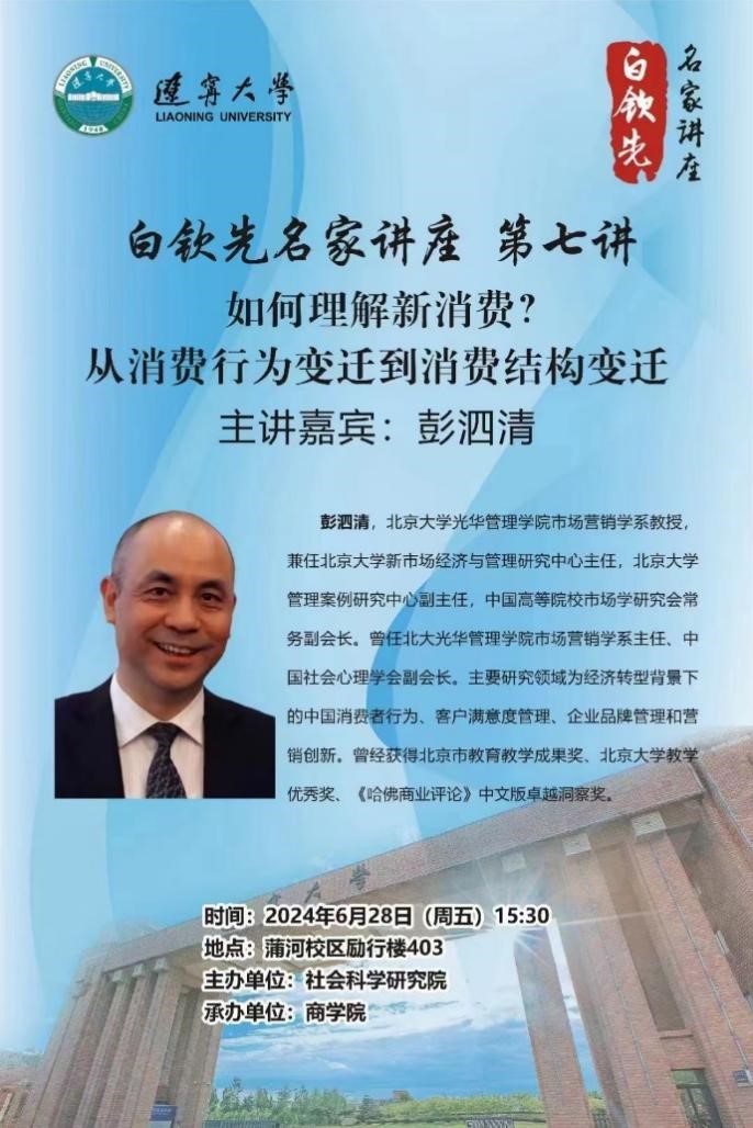 为持续建设高端学术交流平台,拓宽广大师生学术视野,学校瞄准学科发展前沿,开设“白钦先名家讲座”,邀请国内外经济管理类专家学者来校开展专题讲座。“白钦先名家讲座”第七讲将于6月28日(周五)15:30开讲,本次讲座邀请北京大学光华管理学院市场营销学系彭泗清教授作为主讲嘉宾,为广大师生带来题为“如何理解新消费?从消费行为变迁到消费结构变迁”的学术讲座,欢迎广大师生参加。