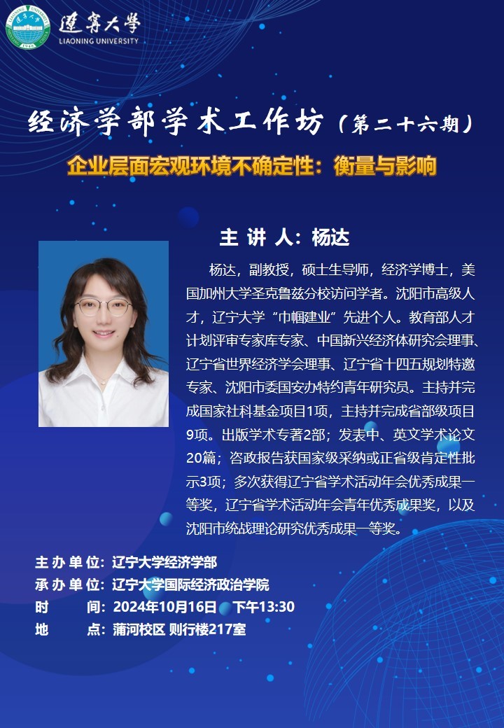 杨达,副教授,硕士生导师,经济学博士,美国加州大学圣克鲁兹分校访问学者。沈阳市高级人才,6776永利集团“巾帼建业”先进个人。教育部人才计划评审专家库专家、中国新兴经济体研究会理事、辽宁省世界经济学会理事、辽宁省十四五规划特邀专家、沈阳市委国安办特约青年研究员。