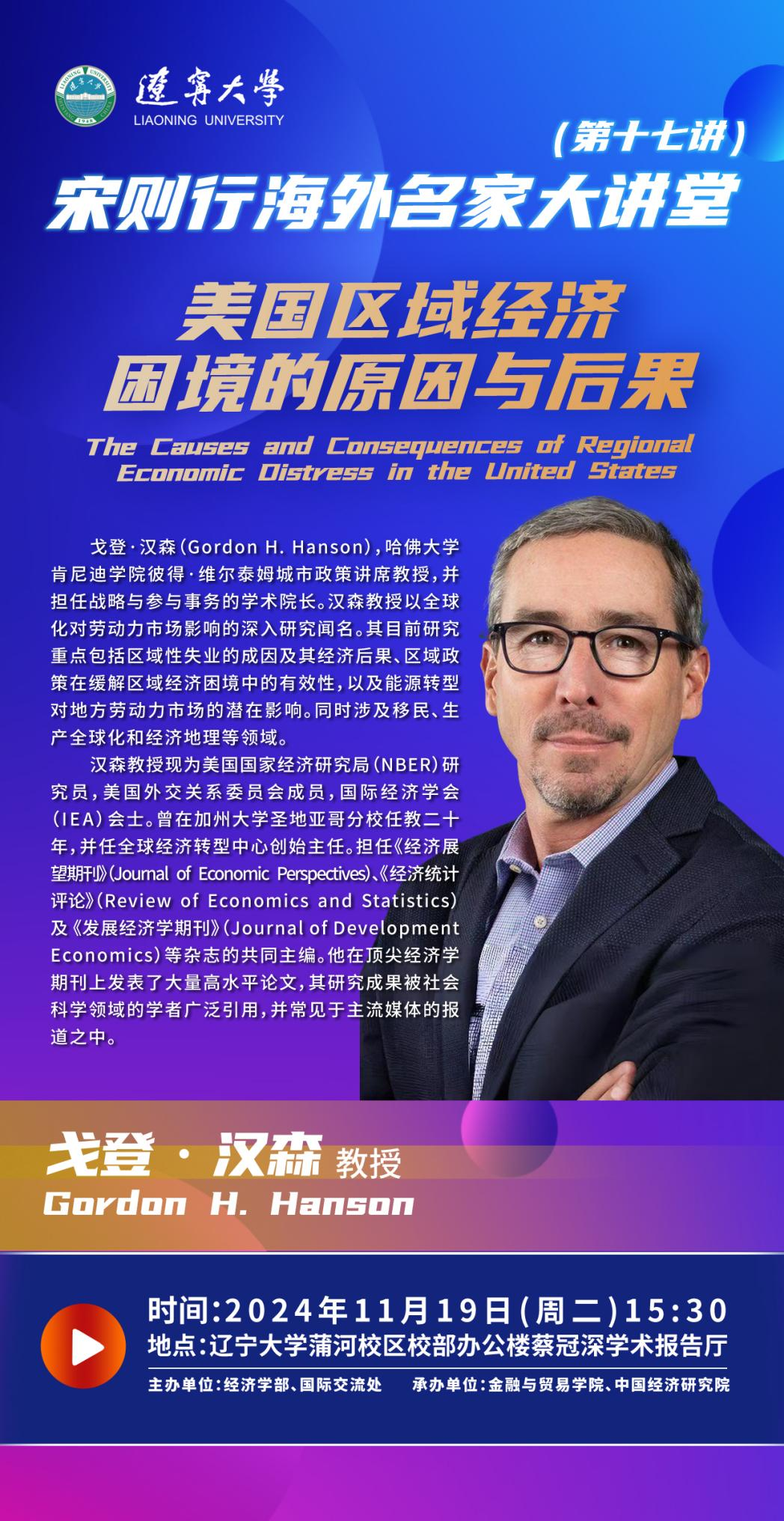 戈登・汉森(Gordon H. Hanson),哈佛大学肯尼迪学院彼得・维尔泰姆城市政策讲席教授,并担任战略与参与事务的学术院长。汉森教授以全球化对劳动力市场影响的深入研究闻名。其目前研究重点包括区域性失业的成因及其经济后果、区域政策在缓解区域经济困境中的有效性,以及能源转型对地方劳动力市场的潜在影响。同时涉及移民、生产全球化和经济地理等领域。