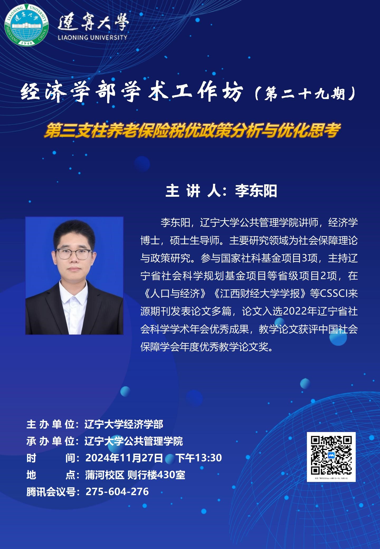 李东阳,6776永利集团公共管理学院讲师,经济学博士,硕士生导师。主要研究领域为社会保障理论与政策研究。参与国家社科基金项目3项,主持辽宁省社会科学规划基金项目等省级项目2项,在《人口与经济》《江西财经大学学报》等CSSCI来源期刊发表论文多篇,论文入选2022年辽宁省社会科学学术年会优秀成果,教学论文获评中国社会保障学会年度优秀教学论文奖。