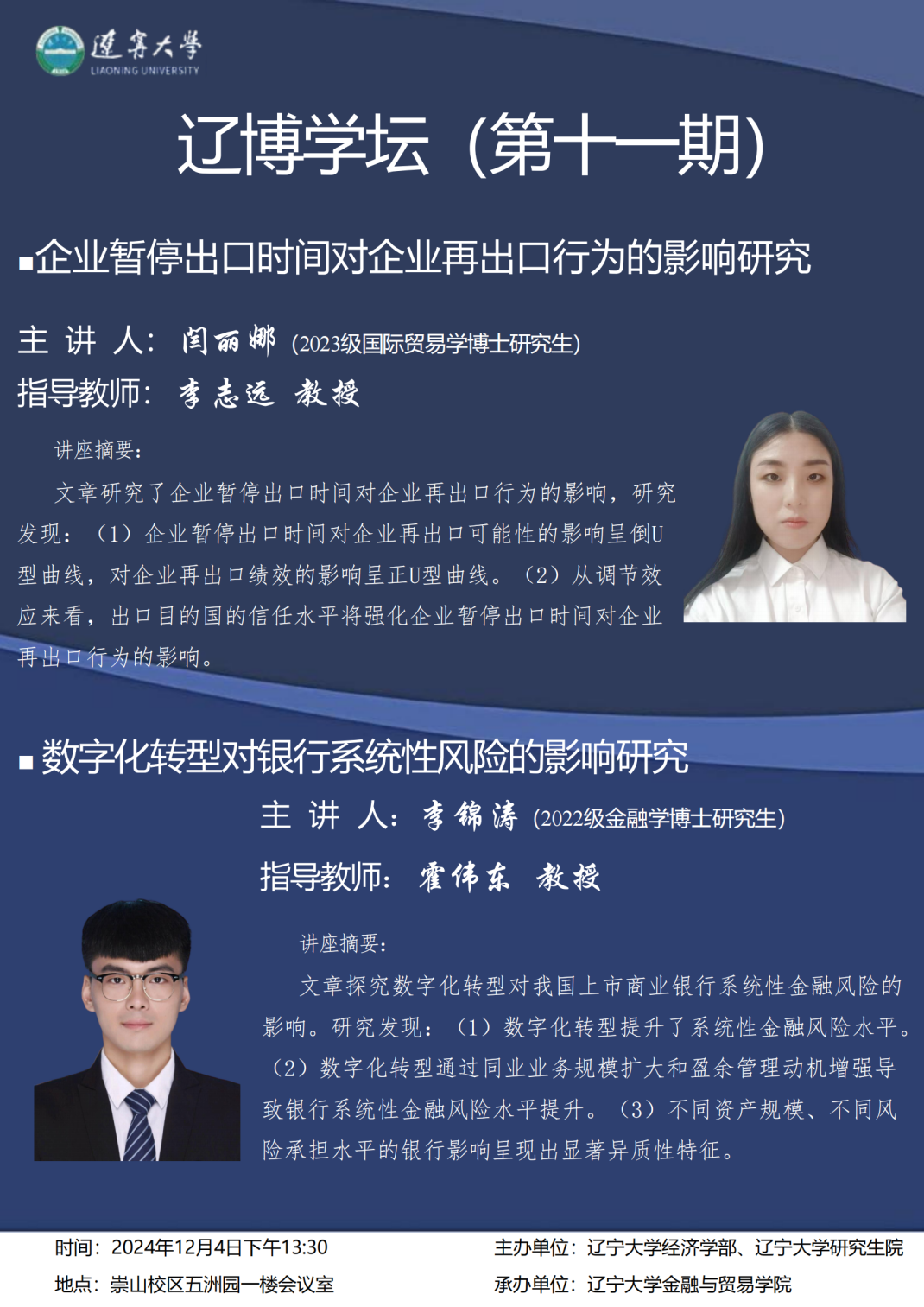 讲座摘要:文章研究了企业暂停出口时间对企业再出口行为的影响。研究发现:(1)企业暂停出口时间对企业再出口可能性的影响呈倒U型曲线,对企业再出口绩效的影响呈正U型曲线。(2)从调节效应来看,出口目的国的信任水平将强化企业暂停出口时间对企业再出口行为的影响。