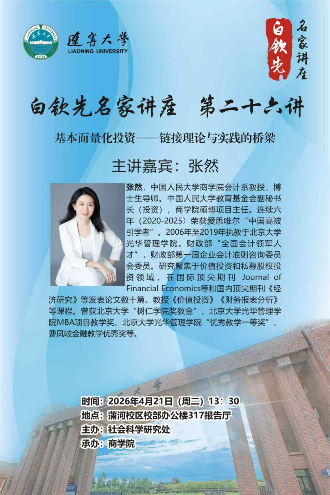 为持续建设高端学术交流平台,拓宽广大师生学术视野,学校瞄准科学发展前沿,同国际接轨,学校开设“白钦先名家讲座”,邀请国内外高学术水平经济类青年学者来校开展专题讲座。白钦先名家讲座第二十六讲将于4月21日(周二)13:30开讲,并邀请到了中国人民大学商学院张然教授作为主讲嘉宾,为师生们带来题为“基本面量化投资--链接理论与实践的桥梁”的学术讲座。