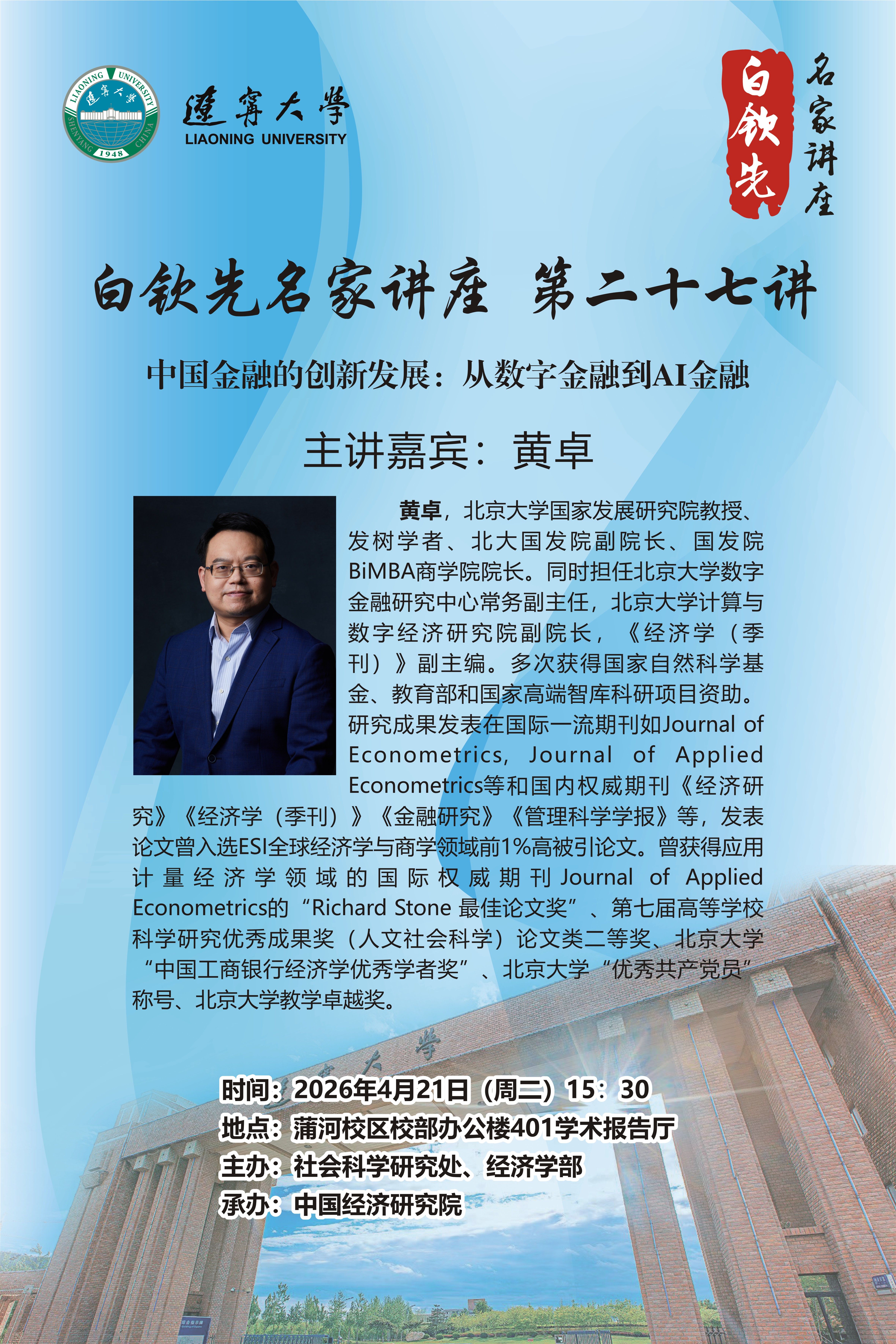 为持续建设高端学术交流平台,拓宽广大师生学术视野,学校瞄准科学发展前沿,同国际接轨,学校开设“白钦先名家讲座”,邀请国内外高学术水平经济类青年学者来校开展专题讲座。白钦先名家讲座第二十七讲将于4月21日(周二)15:30开讲,并邀请到了北京大学国家发展研究院黄卓教授作为主讲嘉宾,为师生们带来题为“中国金融的创新发展:从数字金融到AI金融”的学术讲座。