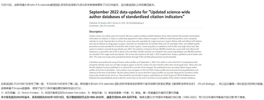 “World’s Top 2% Scientists” selects top 2% scientists from approximately seven million scientists worldwide. The list includes two separate data for career-long impact and single-year impact. Scientists are classified into 22 scientific fields and 176 sub-fields. The list, compiled by the team of Prof. John P.A. Ioannidis of Stanford University, was first released on Mendeley Data in June, 2019. The list of 2022 is the fourth edition. 200,409 scientists were selected to be included in the database, among which 7795 scientists has been admitted to the Career-Long Impact list of World’s Top 2% Scientists. The list uses data provided by Elsevier Scopus, is based on standardized information on citations, h-index, co-authorship adjusted hm-index, citations to papers in different authorship positions and a composite indicator (c-score). All indicators are used to make comprehensive evaluations on scientists’ research status and long-term research performance, through which scientists’ academic impact are reflected in a true and objective way. Being admitted to the list not only shows that these scientists are at the forefront of their research fields and that their research achievements have been widely recognized, but it also demonstrates the strong scientific research capability of the institutions where they work.
