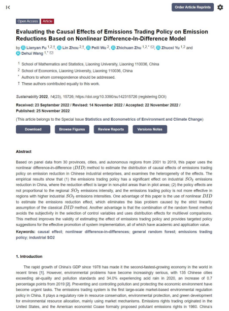 近日,数学与统计学院付连艳副教授作为第一作者的合作论文Evaluating the Causal Effects of Emissions Trading Policy on Emission Reductions Based on Nonlinear Difference-In-Difference Model在Sustainability发表。