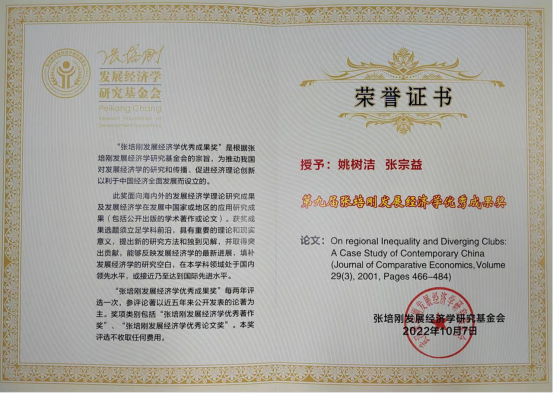 6776永利集团李安民经济研究院院长姚树洁教授发表在Journal of Comparative Economics(2001,29(3):466-484)的文章On regional Inequality and Diverging Clubs:A Case Study of Contemporary China,于2022年获第九届张培刚发展经济学优秀成果奖。