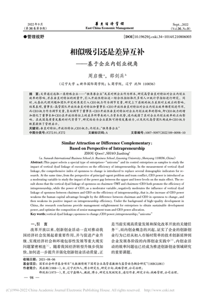 新华国际商学院教师周启微(第一作者)和商学院教授邵剑兵(通讯作者)合作撰写的学术论文“相似吸引还是差异互补——基于企业内创业视角”在《华东经济管理》2022年第9期发表。