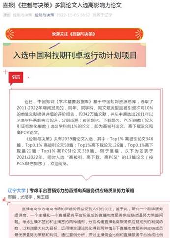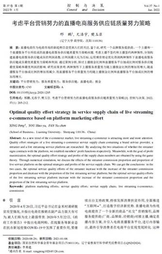商学院副教授邢鹏作为第一作者和通讯作者,与硕士研究生尤浩宇、副教授樊玉臣合作在《控制与决策》2022年第1期发表封面文章“考虑平台营销努力的直播电商服务供应链质量努力策略”,并入选中国知网《学术精要数据库》2011-2022年“高被引、高下载、高PCSI”论文。