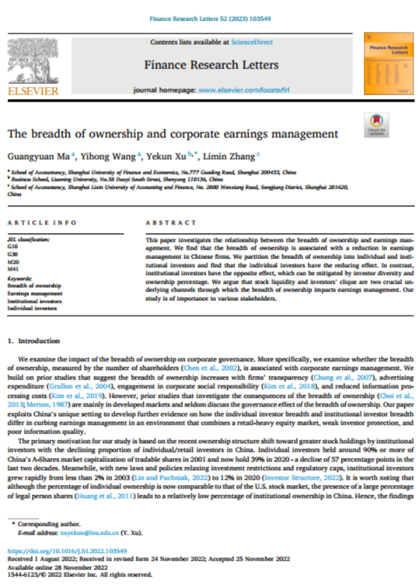 商学院徐业坤教授作为通讯作者的合作论文The breadth of ownership and corporate earnings management在国际知名期刊Finance Research Letters发表。