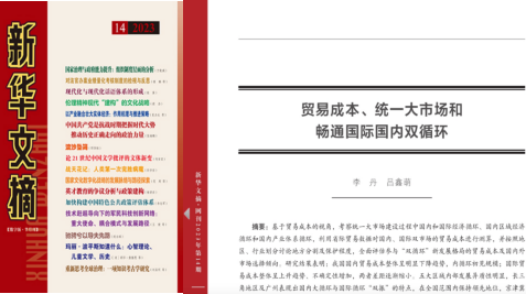 金融与贸易学院李丹教授(第一作者)和博士研究生吕鑫萌发表在《中国特色社会主义研究》2023年第1期的论文“贸易成本、统一大市场和畅通国际国内双循环”被《新华文摘》2023年第14期全文转载。