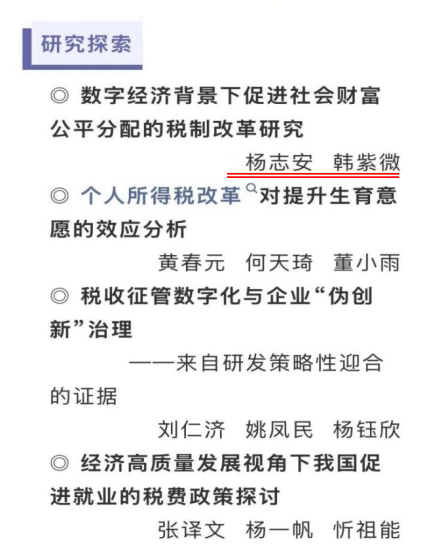 经济学院杨志安教授与其指导的博士生韩紫微在CSSCI期刊《税务研究》2026年第4期发表论文《数字经济背景下促进社会财富公平分配的税制改革研究》。