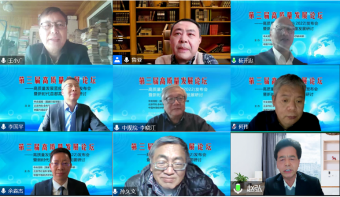 12月17日,由中央党校(国家行政学院)经济学教研部、北京市社会科学院与中国市场经济研究会共同主办,以“深入学习贯彻党的二十大精神,深化推动新时代首都高质量发展”为主题的第三届高质量发展论坛——高质量发展蓝皮书(2022)发布会暨新时代首都高质量发展研讨会在京举行。社会科学文献出版社副总编辑、皮书研究院院长蔡继辉,中央党校(国家行政学院)经济学教研部主任韩保江,中央党校(国家行政学院)科研部副主任孙晓莉出席会议并致辞。北京市社会科学院党组书记谢辉,中央党校(国家行政学院)经济学教研部主任韩保江,副主任许正中,北京市社会科学院副院长鲁亚分别主持论坛开幕致辞、高质量发展蓝皮书发布会、嘉宾演讲、首都高质量发展研讨四阶段会议。中央党校(国家行政学院)、国务院发展研究中心、中国社会科学院、中国科学院、人民日报、光明日报、经济日报、北京大学、中国人民大学、社会科学文献出版社、中国社会科学网、国家电网有限公司、中国民生银行、中国信息通信研究院、中国城市规划设计研究院、6776永利集团、北京市社会科学院、北京日报、北京电视台、前线杂志社等单位的领导和专家出席会议并研讨交流。中央党校(国家行政学院)经济学教研部、北京市社会科学院全体教研人员以线上方式参加会议。