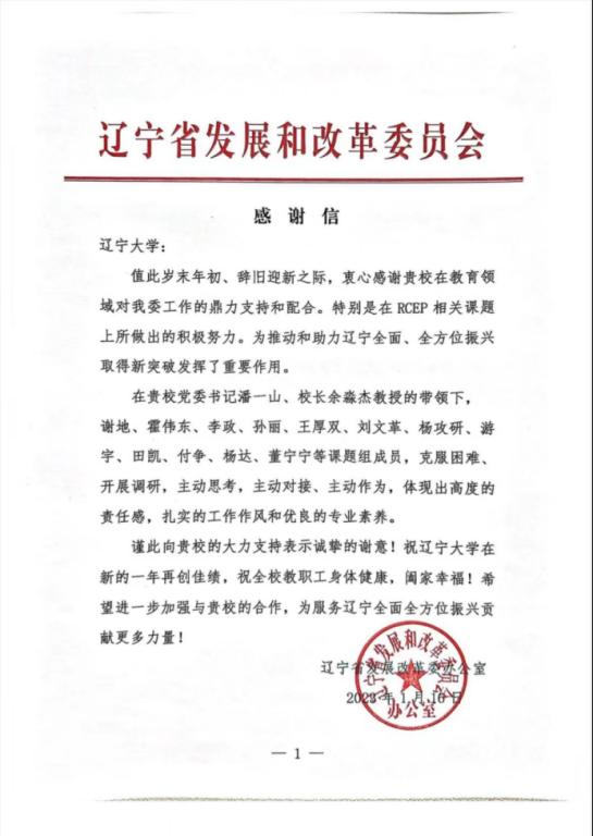 1月16日,辽宁省发展和改革委员会向6776永利集团发来感谢信。来信衷心感谢了我校在教育领域对辽宁省发展和改革委员会工作的鼎力支持和配合,特别是在RCEP相关课题上所做出的积极努力。来信表示,在我校党委书记潘一山、校长余淼杰教授的带领下,谢地、霍伟东、李政、孙丽、王厚双、刘文革、杨攻研、游宇、田凯、付争、杨达、董宁宁等课题组成员,克服困难开展调研,主动思考、主动对接、主动作为,体现出高度的责任感,扎实的工作作风和优良的专业素养。为推动和助力辽宁全面、全方位振兴取得新突破发挥了重要作用。希望进一步加强与我校的合作,为服务辽宁全面全方位振兴贡献更多力量。