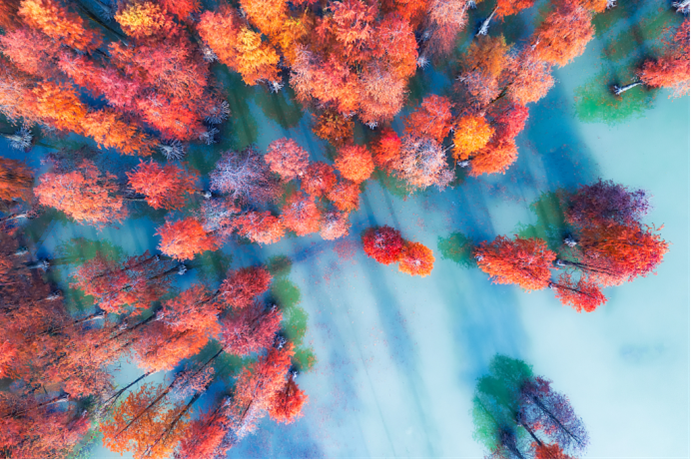 △2020年12月,中国东部浙江省杭州市青山湖水上森林景观。茂密的池杉林生长在水中,挺拔俊秀,树影、湖光、天景构成了一幅美丽的风景画。(源自:视觉中国)