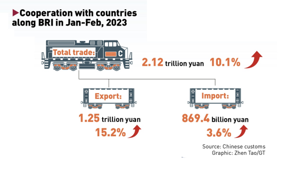 In the first two months of 2023, China's trade with the BRI market registered a 10.1-percent-increase year-on-year, totaling 2.12 trillion yuan, whereas total foreign trade edged down 0.8 percent year-on-year, data from the General Administration of Customs showed on Tuesday.