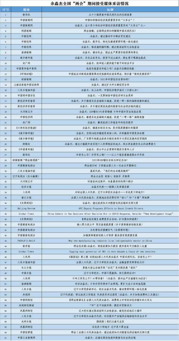 两会期间,他接受新华社、《人民日报》、央视网等各级各类媒体采访60余次,结合专业深入解读政府工作报告中的经济数字。余淼杰深受中央媒体的关注,《人民日报》(人民网)刊发采访9篇、中央广播电视总台(央视网、央广网)刊发4篇,新华社刊发2篇,《光明日报》刊发1篇。同时,他还广受经济日报、中国经济网、《21世纪经济报道》、中新经纬、凤凰网财经等财经类媒体的关注。其中,人民网专访《中国式现代化,当前怎么干?》在人民网两会专题首页发布,《一定要相信中国经济明天会更好》在中国网首页发布。