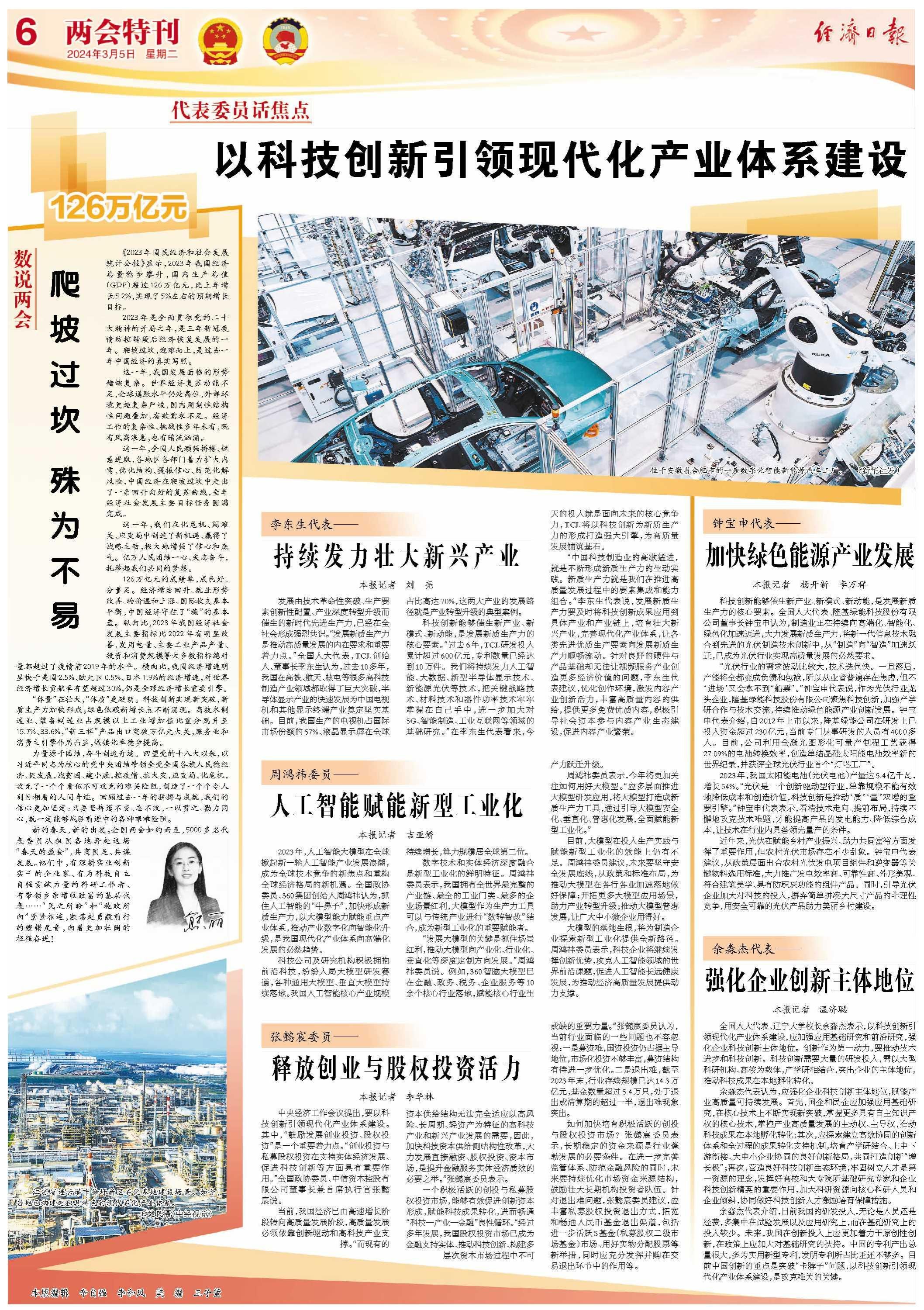 余淼杰代表认为,应强化企业科技创新主体地位,赋能产业高质量可持续发展。首先,国企和民企应加强应用基础研究,在核心技术上不断实现新突破,掌握更多具有自主知识产权的核心技术,掌控产业高质量发展的主动权、主导权,推动科技成果在本地孵化转化;其次,应探索建立高效协同的创新体系和全过程的成果转化支持机制,培育产学研结合、上中下游衔接、大中小企业协同的良好创新格局,共同打造创新“增长极”;再次,营造良好科技创新生态环境,牢固树立人才是第一资源的理念,发挥好高校和大专院所基础研究专家和企业科技创新精英的重要作用,加大科研资源向核心科研人员和企业倾斜,协同做好科技创新人才激励培育保障措施。