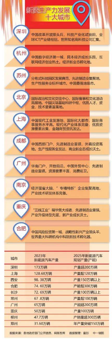 新能源汽车产业是培育新质生产力的重要引擎。从2023年各地新能源汽车产量看,东部引领、中西部跟进的态势越发鲜明。其中,深圳依托“产业创新+科技领先”绝对优势,首次登顶“新能源汽车第一城”,2023年深圳新能源汽车产量178.6万辆,超过了上海的128.68万辆和西安的98.38万辆,位居全国第一位。中部地区的合肥、长沙,西部地区的西安、重庆以及东部地区的济南跻身2023年新能源汽车产量前十城市。
